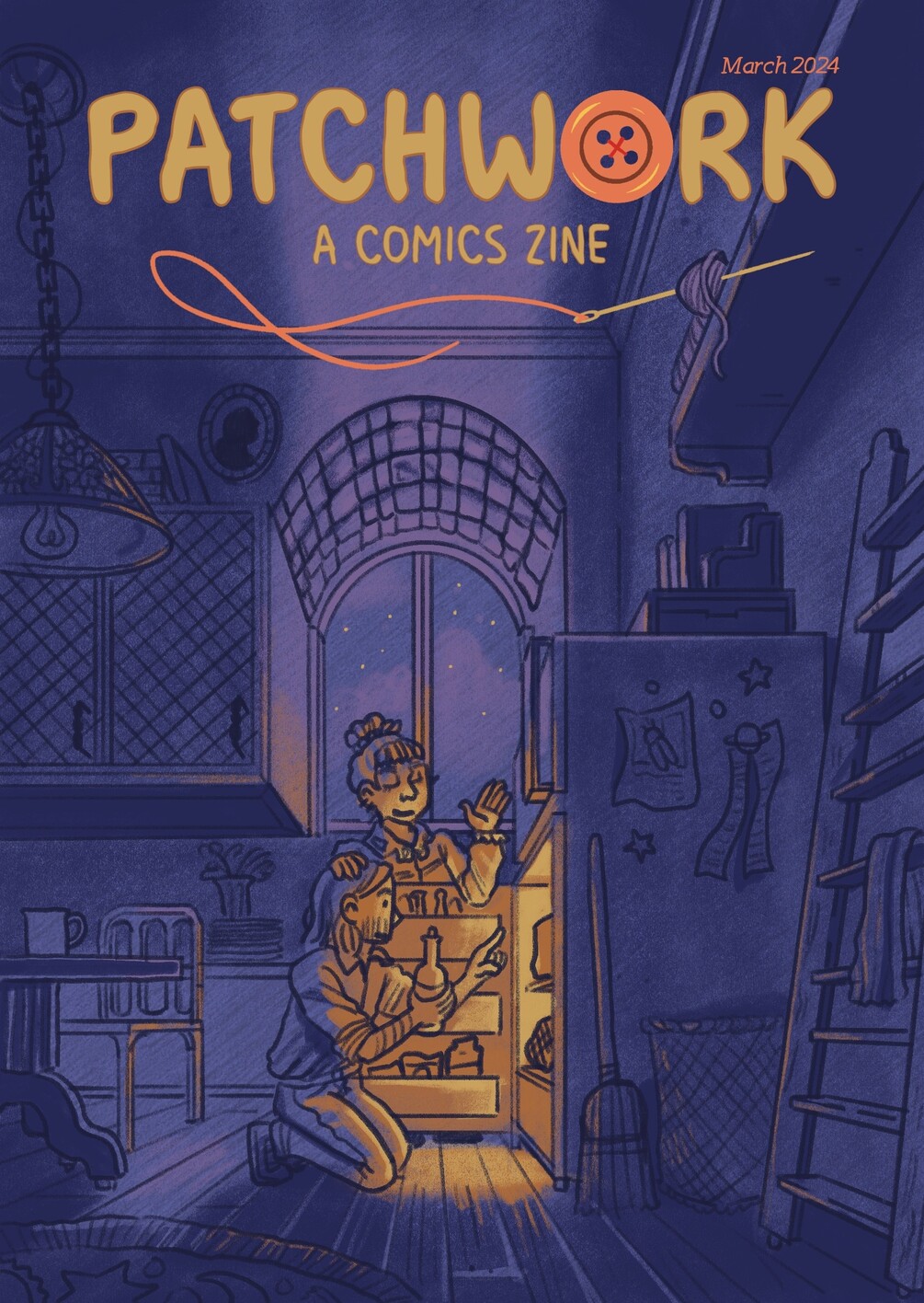 This is the March 2024 issue of Patchwork: A Comics Zine. It features artwork and storytelling by Jordan Chase, Amelia Board, Audrey Meeker, Jackie Kuhn, Nur Schuba, Joli Hamada, and Sarah Davidson. Cover art by Audrey Meeker.